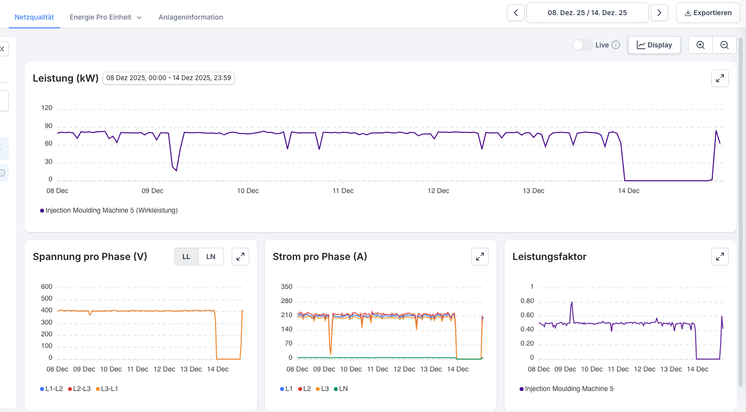 - Muster in Leistung, Spannung, Strom und Leistungsfaktor vergleichen, um Anomalien zu erkennen