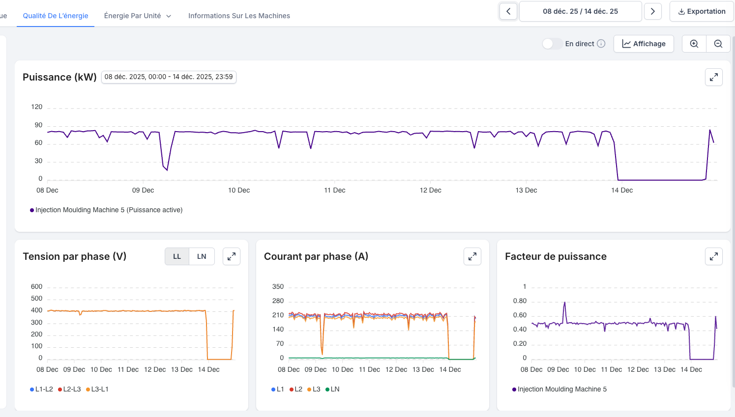 L’onglet Qualité de l’Énergie vous offre une vue détaillée (en temps réel) sur la qualité de votre alimentation électrique et la performance de vos équipements. En surveillant les principaux paramètres électriques, vous pouvez détecter des irrégularités, identifier des inefficacités et anticiper d’éventuels problèmes.