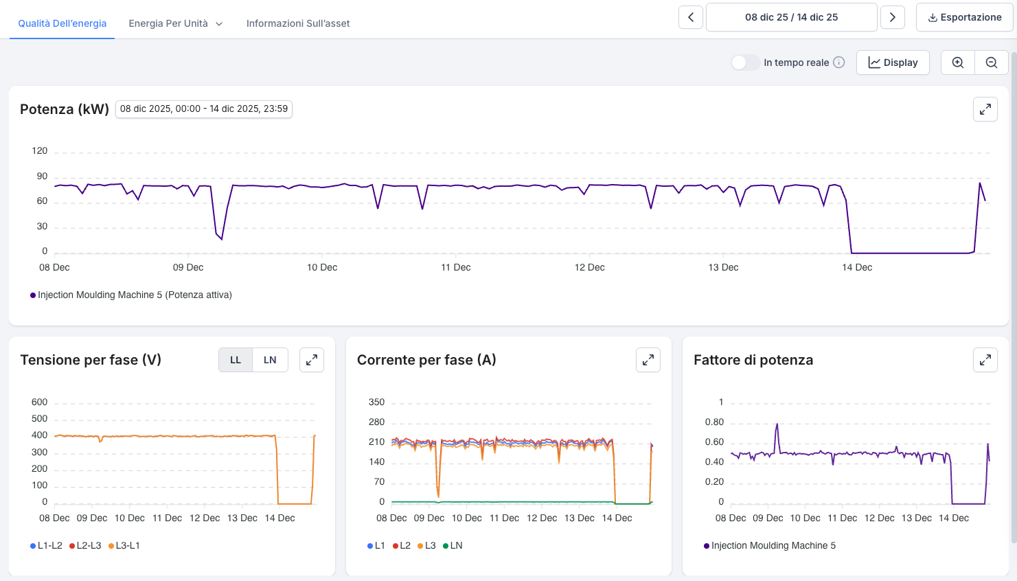 La scheda Qualità dell’Energia fornisce approfondimenti dettagliati (in tempo reale) sulla qualità della fornitura elettrica e sulle prestazioni dei tuoi asset. Monitorando i principali parametri elettrici, puoi rilevare irregolarità, identificare inefficienze e possibili problemi.