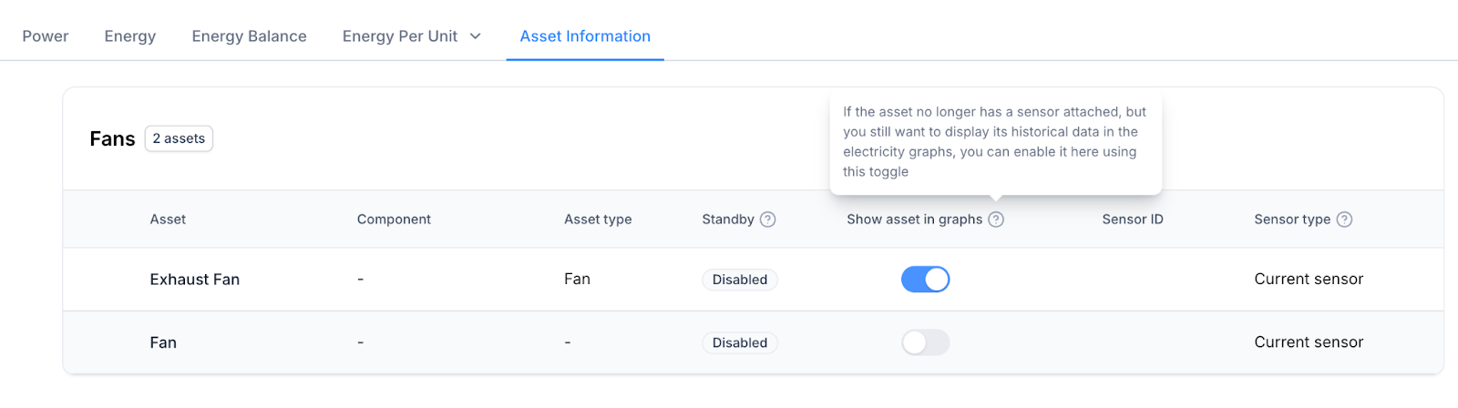 When an electricity sensor is detached from an asset, that asset will no longer appear in the electricity graphs.