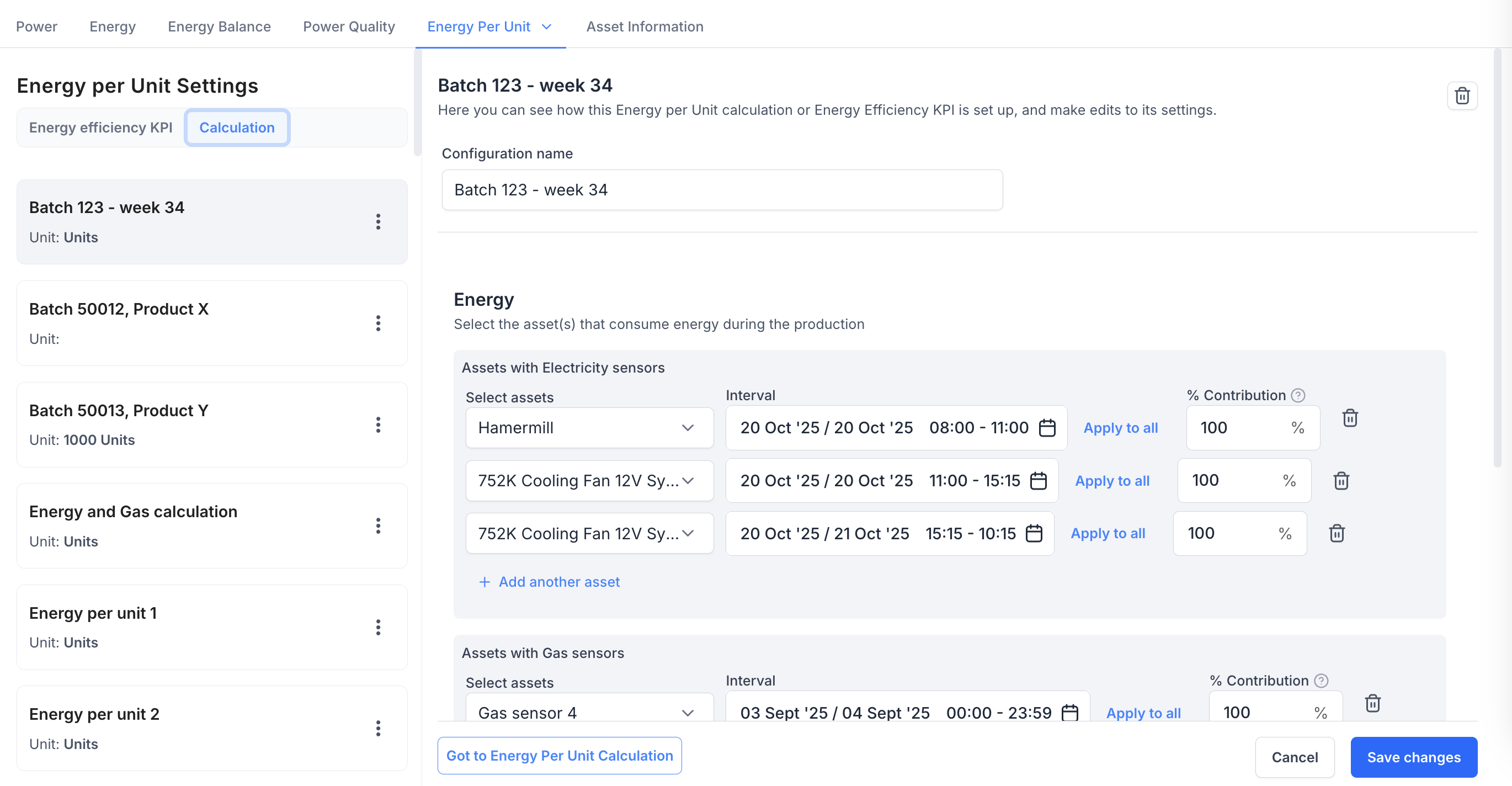 The Energy per Unit Settings page allows you to view, edit, and delete the setup of your saved Energy per Unit Calculations and Energy Efficiency KPIs. From this page, you can easily manage all your energy per unit configurations in one place.