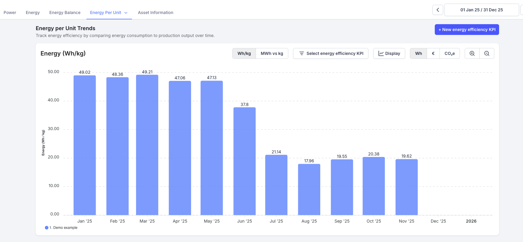 Energy per unit is a key metric that shows how much energy is consumed for each unit of production output (e.g., kWh/unit, kWh/kg). This type of energy efficiency KPI is also known as an Energy Performance Indicator (EnPI) under the ISO 50.001 energy management standard.
