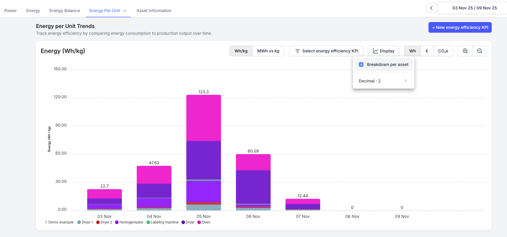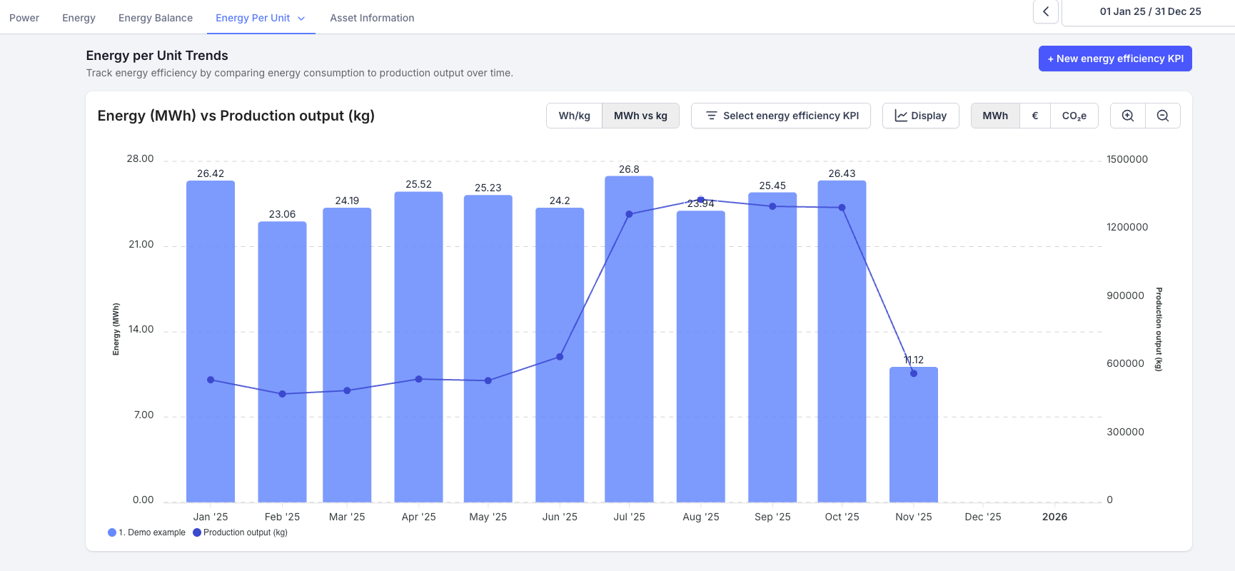 Once created, your energy efficiency KPI will appear on the ‘Energy per Unit Trends’ graph.